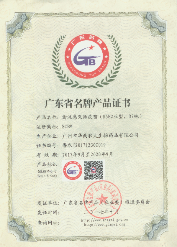 為貫徹落實廣東省委、省政府關于實施名牌帶動戰略的重要部署,不斷提高廣東省農產品質量和市場競爭力,根據《廣東省名牌帶動戰略實施方案》和《廣東省名牌產品(農業類)管理辦法》,經廣東省南方名牌農產品推進中心組織專家評審和廣東省名牌產品(農業類)推進委員會審核,廣州市華南農大生物藥品有限公司產品獲得“廣東省名牌產品”稱號,此次共評出2017年廣東省名牌產品(農業類)453個,其中初評產品212個,到期復審產品241個。