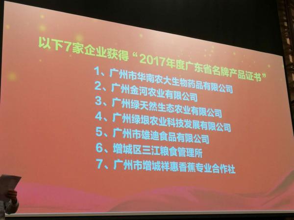為提高廣東省名牌產品(農業類)的知名度,鼓勵農業企業爭創名牌,做大做強我省農業品牌,廣東省農業廳決定在全省范圍內對獲得2017年廣東省名牌產品(農業類)的生產企業予以通報表彰,并頒發“廣東省名牌產品”證書。2018年1月25日,廣州市增城區農業企業協會召開以“產融對接、助推農企,不忘初心、服務會員”為主題的2017年年會暨省名牌產品頒牌儀式,廣州市增城區獲得“2017年度廣東省名牌產品”證書的企業有7家。