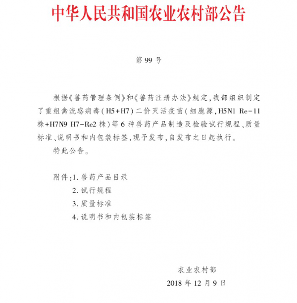 信息來源:中華人民共和國農(nóng)業(yè)農(nóng)村部公告 第99號http://www.moa.gov.cn/govpublic/SYJ/201812/t20181213_6164848.htm