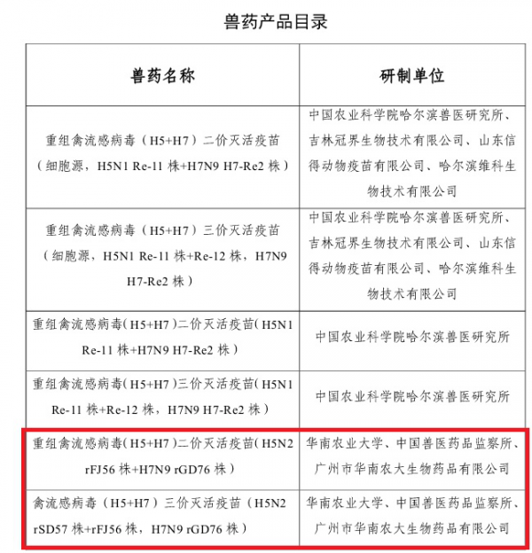 熱烈祝賀華南農(nóng)業(yè)大學(xué)、中國獸醫(yī)藥品監(jiān)察所與廣州市華南農(nóng)大生物藥品有限公司聯(lián)合研制的重組禽流感病毒(H5+H7)二價滅活疫苗(H5N2 rFJ56株+H7N9 rGD76株)和重組禽流感病毒(H5+H7)三價滅活疫苗(H5N2 rSD57株+rFJ56株,H7N9 rGD76株)兩個產(chǎn)品通過農(nóng)業(yè)農(nóng)村部新獸藥評價!??!