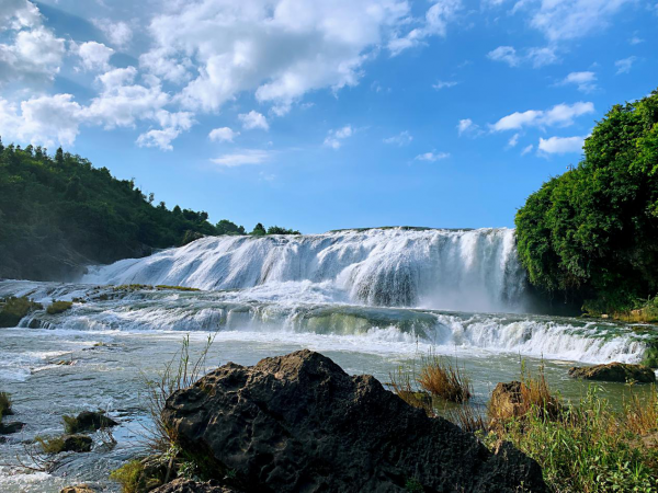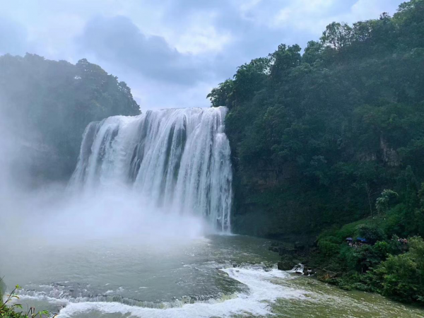 7月盛夏,正值黃果樹大瀑布豐水季節,相隔數里仍能聽見瀑聲滔天。站在觀景臺上,只見萬練飛空,一瀉千里,氣勢磅礴令人震撼。瀑布半腰有一寬134米的水簾洞全程自然貫穿,在洞內能聽瀑聲、觀瀑布、摸瀑水,是86版《西游記》“猴王出世”的拍攝點。