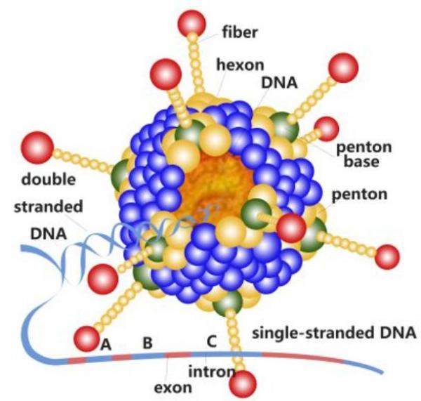 FAdV-Ⅰ為腺病毒科腺病毒屬病毒,無囊膜,直徑為70-90nm,呈20面體對稱結構。表面由252個殼粒組成,包括240個六棱體和12個五棱體,每個五棱體有2條纖維突起。中間包著直徑60-65nm的髓蕊(雙股DNA和核蛋白),殼粒排列在三角形的面上,每邊6個殼粒。禽腺病毒具有2根長度相近的纖絲,纖絲的長度與抗原性有關。